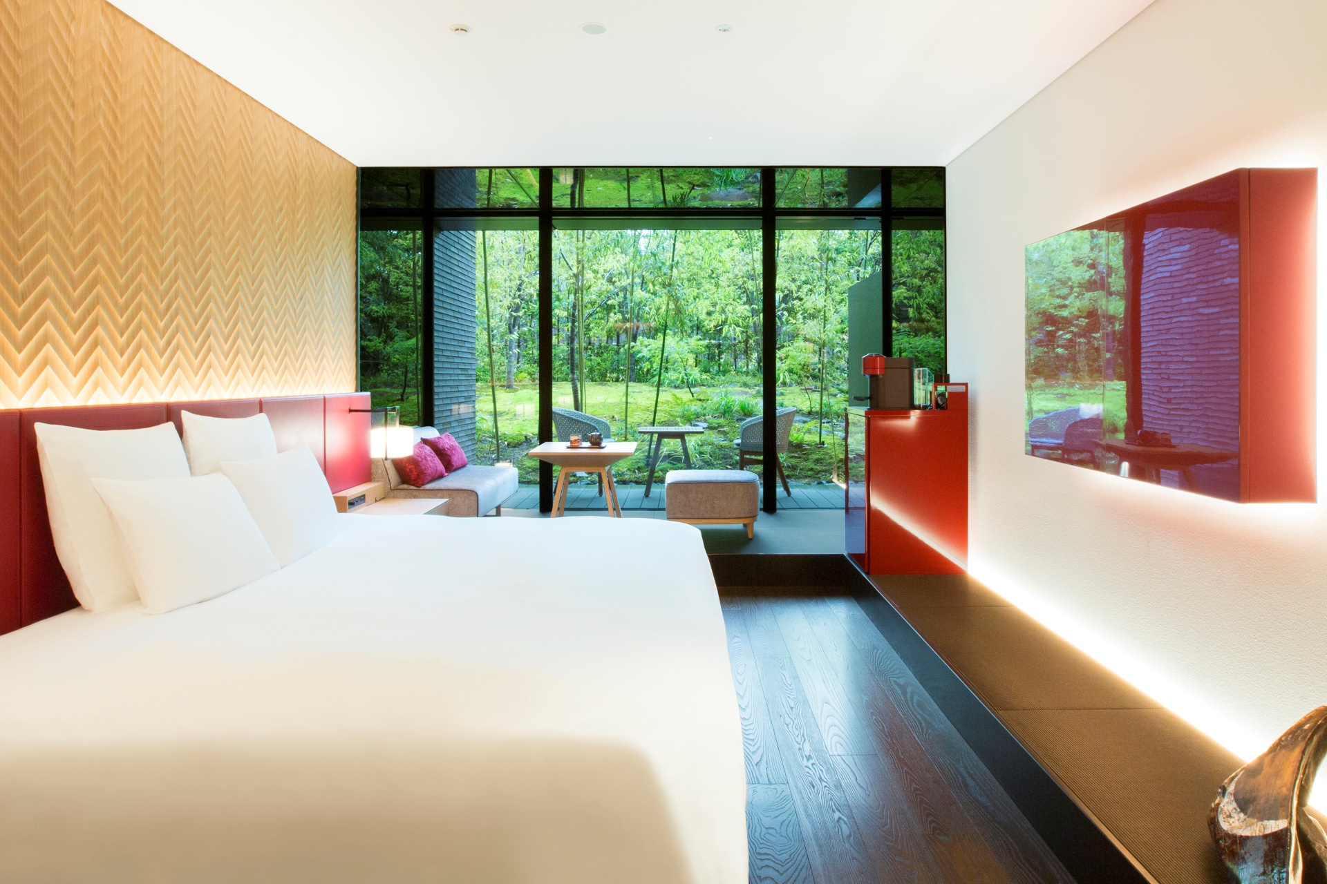 二条城の二の丸庭園からインスパイアされた竹林がテラス前に広がるデラックスルーム。まるで箱庭のような、あなただけの庭園をお楽しみください。インテリアには繊細な漆塗りの家具と、日本の伝統工芸である名栗加工が施されたヘッドボードなど、職人の手によって作られた美しさが散りばめられています。